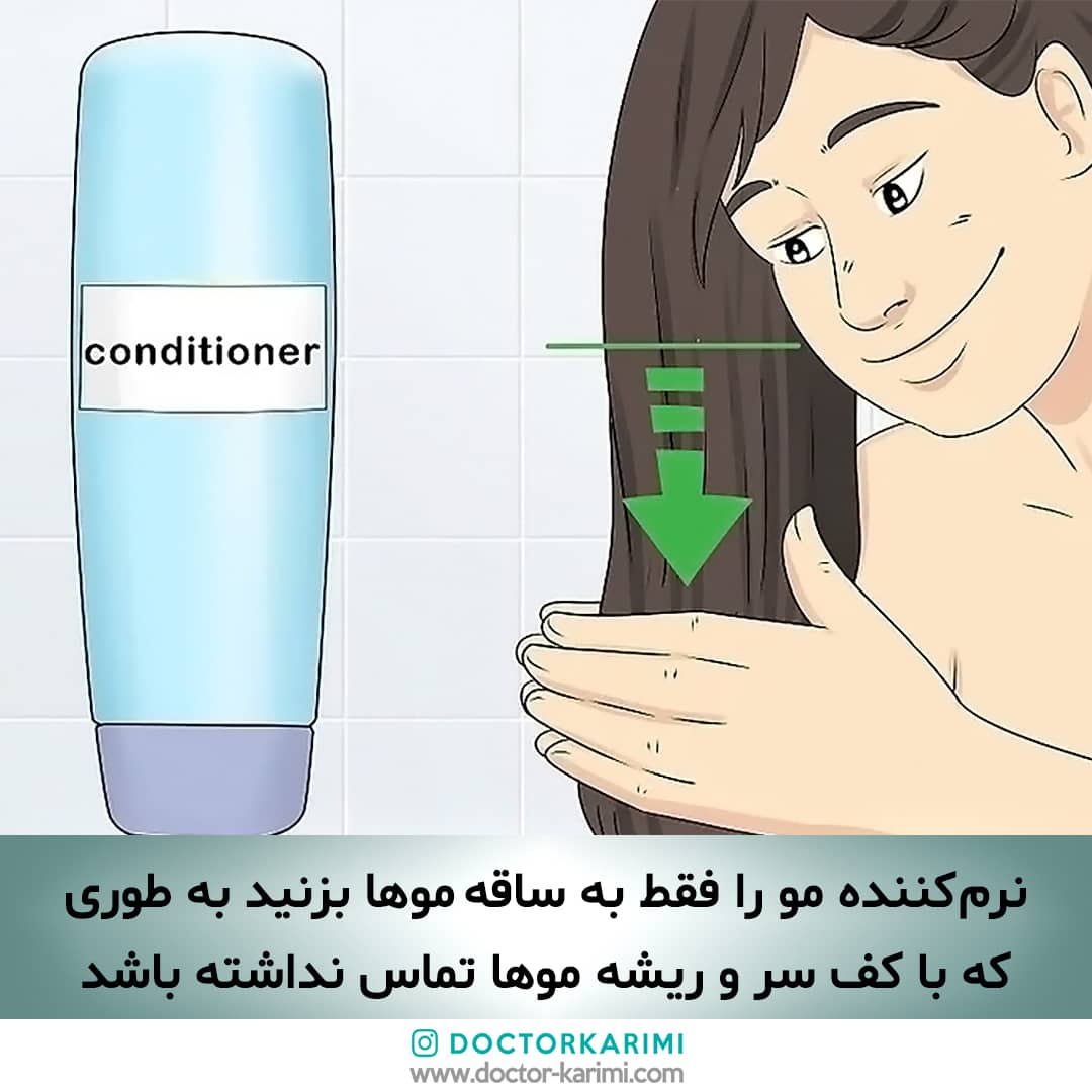 ۵. در پایان پایان، حتما از نرم کننده یا ماسک مو در داخل حمام استفاده کنید و آنرا فقط به ساقه مو بزنید. دقت کنید که نرم کننده یا ماسک موها به کف سر نزنید، زیرا برای ریشه مو ممکن است آزار دهنده باشد و باعث ریزش موها شود.