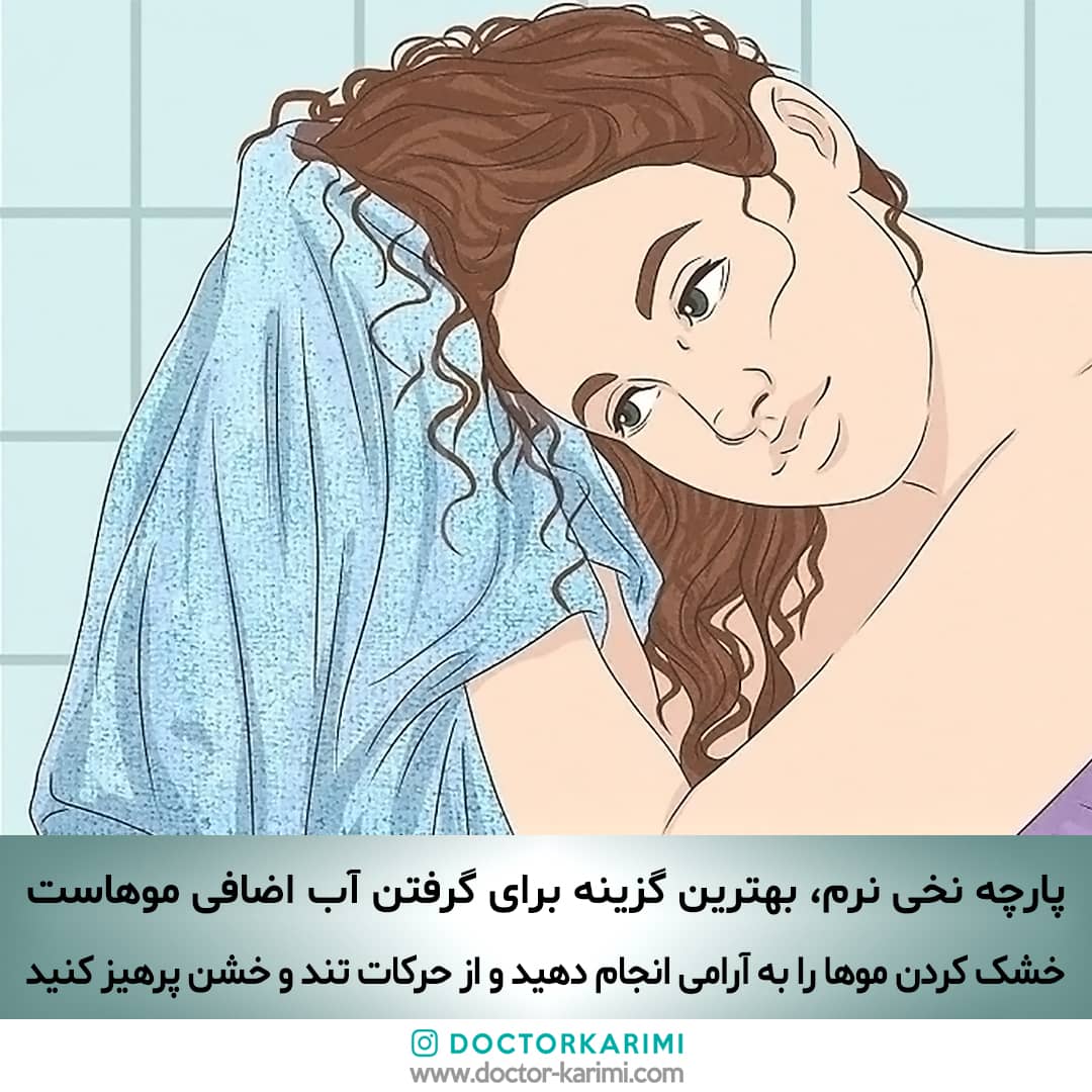 ۲. خشک کردن موها به آرامی انجام شود. حرکات تند و خشن برای خشک کردن مو انجام دهنده.