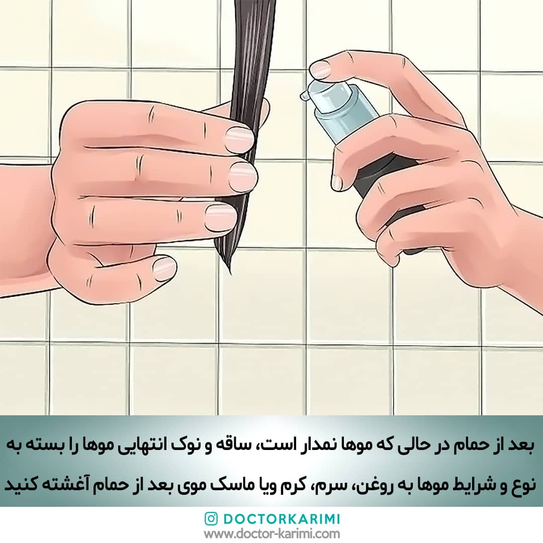 ۳. در حالی که موها نمدار است، ساقه و نوک انتهایی موها را به سرم، یا کرم مو، یا روغن مو، ویا ماسک موی پس از حمام (باتوجه به نوع و نیاز مو) آغشته کنید.